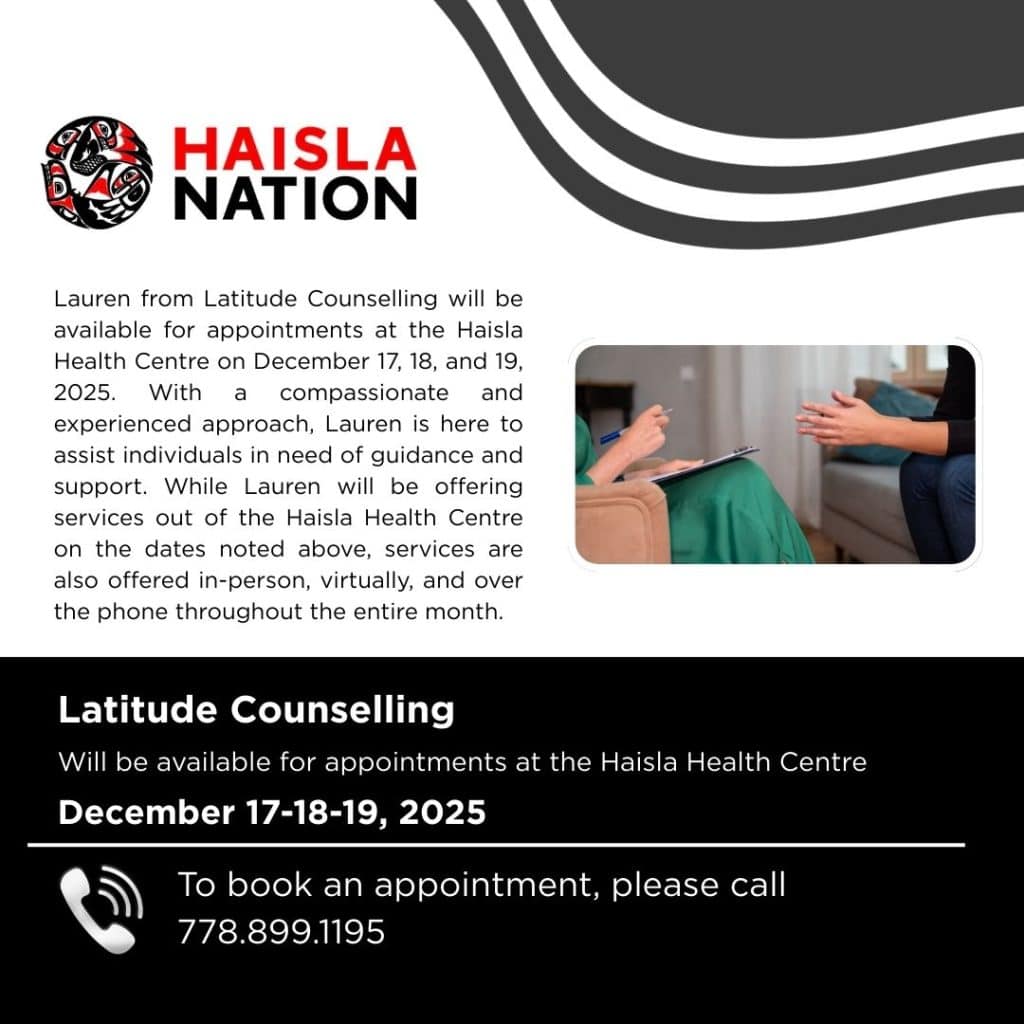 In December 2025 Lauren from Latitude Counselling will be available at the Haisla Health Centre and can be reached at 778.899.1195. Please see notice below for full details.