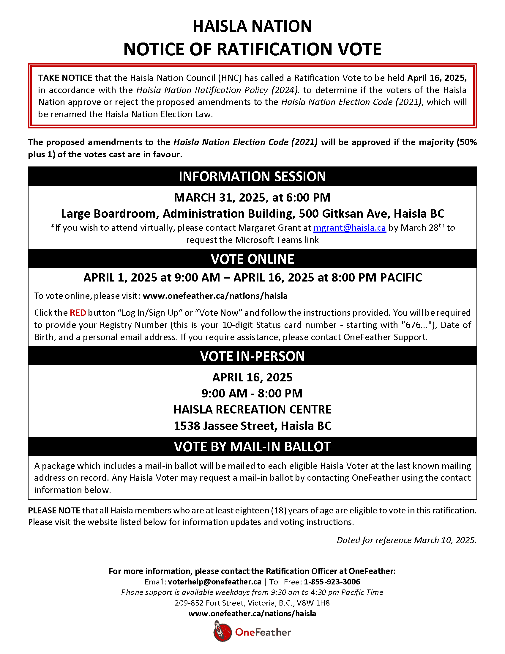 Please see notice of upcoming Ratification vote regarding the Haisla Nation Election Code. A package which includes a mail-in ballot will be mailed to each eligible Haisla Voter at the…