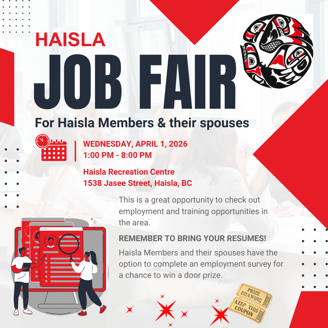 The Employment & Training department will be holding a job fair at the Haisla Recreation Centre on April 1, 2026 from 1:00 pm to 8:00 pm.