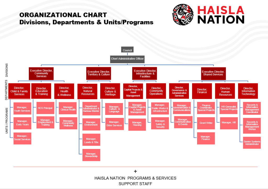 The Haisla Nation operates through a clear and collaborative organizational structure designed to support efficient program delivery and strong governance.